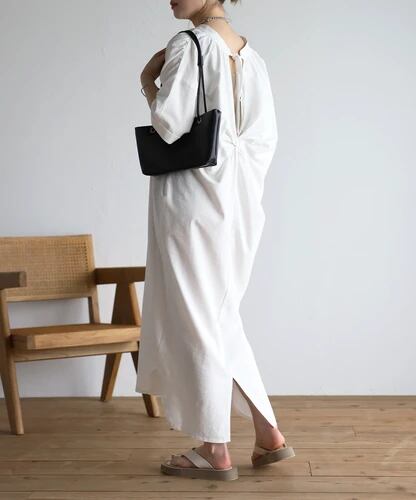 マキシ丈に空いた襟元というデザインが、バランスの整ったシルエットに。